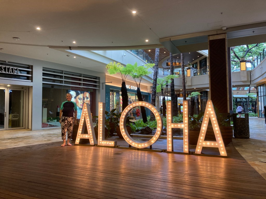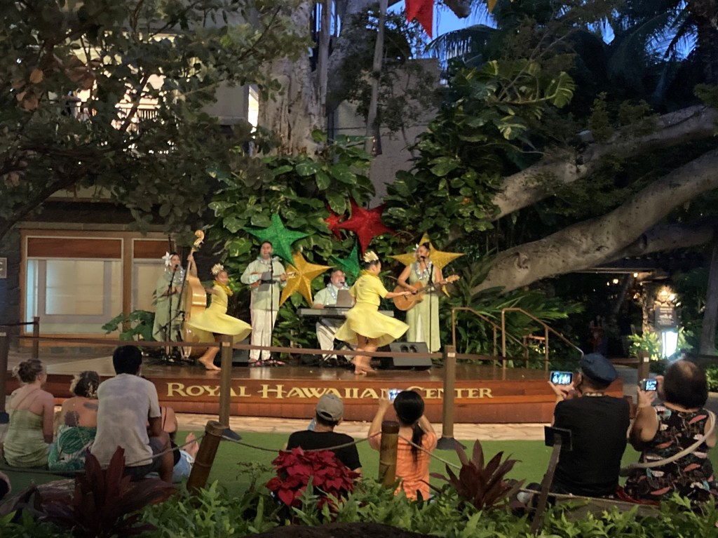 So we walk through the Royal Hawaiian Center, stopping to watch the Hula Performance. There are cultural shows most evenings at the Royal Grove. When we visited, the show had a Christmas theme, with some classics like Jingle Bells and White Christmas, plus a cute number called Island Christmas, about hanging your decorations on your coconut tree and waiting for Santa to bring you presents in a canoe.