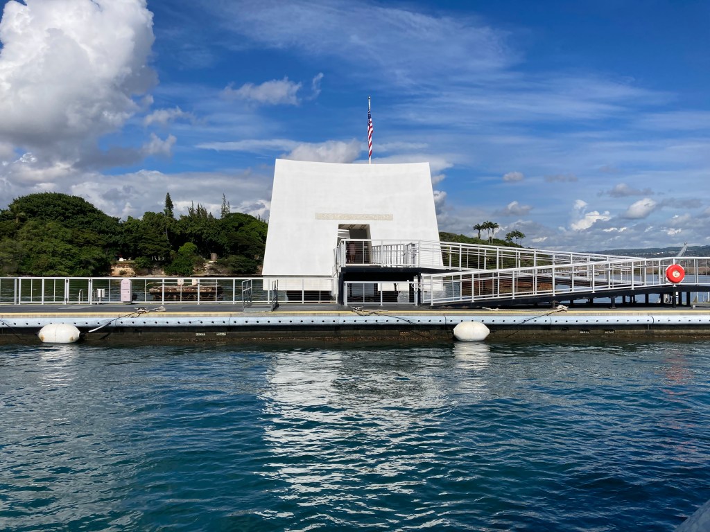 A floating memorial platform has been built over the sunken USS Arizona. A fleet of boats ferry tourists across the harbour to the memorial. We board one of these boats, operated by the US Navy. The boat is driven by a marine who looks like he’s auditioning for a Village People tribute act. Daughter no 1 prevents me from taking a photo of said Village People wannabe.