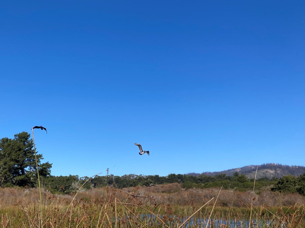 The first part involves walking between the ocean and a lake, basically under a pelican flight path. We watch the birds as they come overhead so low that water dripping out of their bills drips onto our heads.