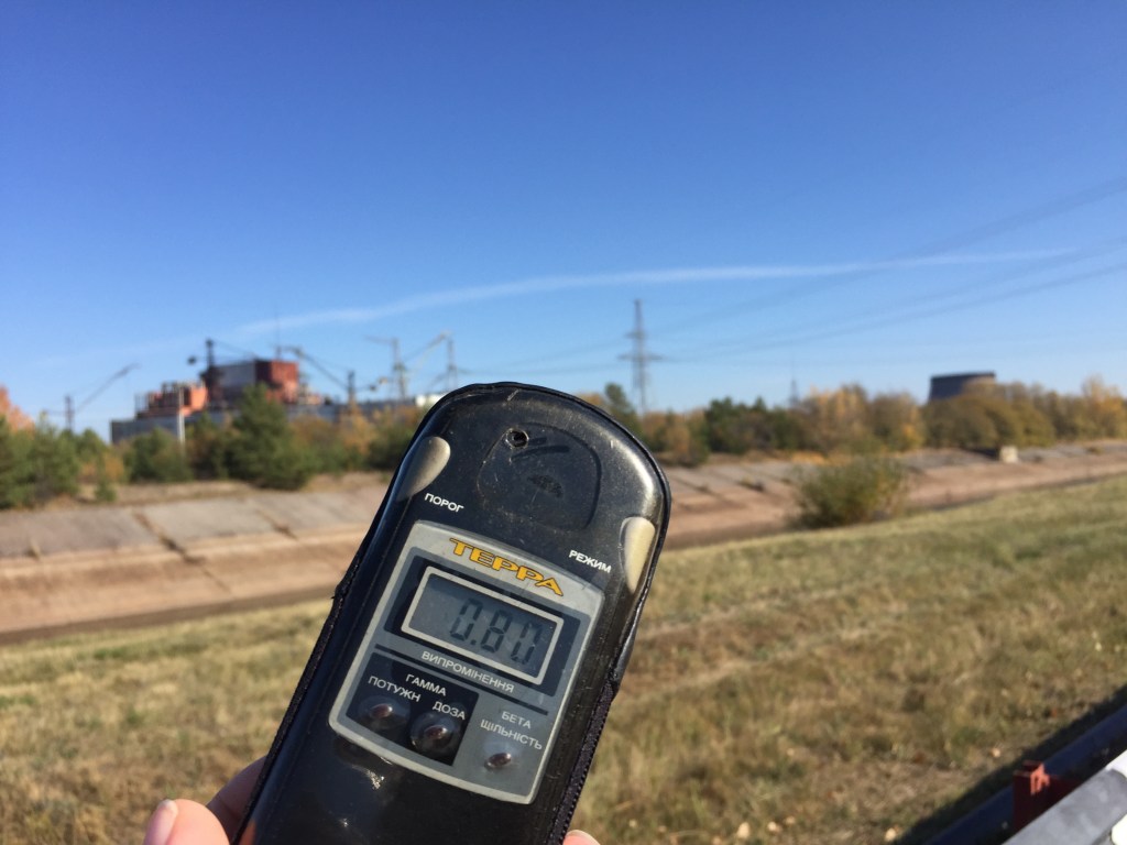 Eventually we’re off again and stop on the river bank for our first view of the power plant. The Geiger counter goes crazy. From a reading of 0.1 in Kyiv, we are up to 1.3. The alarm sounds at above 0.2, so eventually we turn it off because the noise becomes annoying.