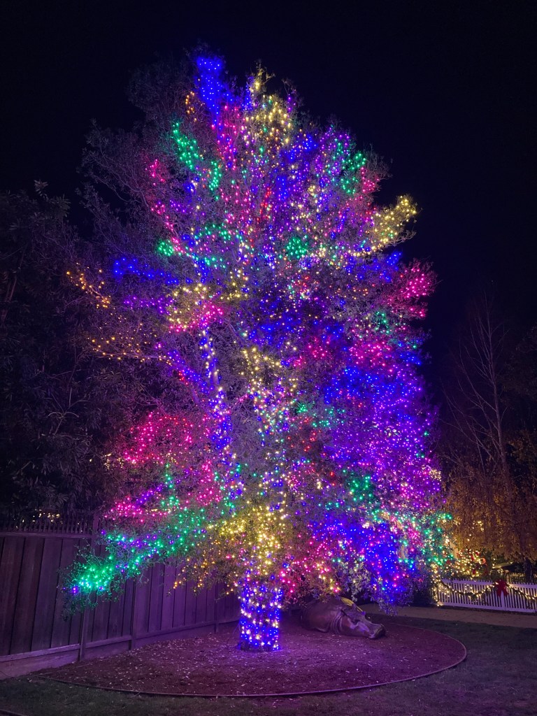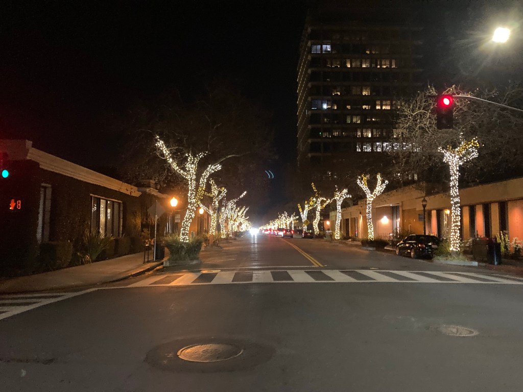 In the evening, after a rather interesting sprout based teriyaki stir fry, we take Mariah for one last walk, taking in some of Palo Alto’s Christmas decorations. Downtown is looking very festive with its illuminated trees.