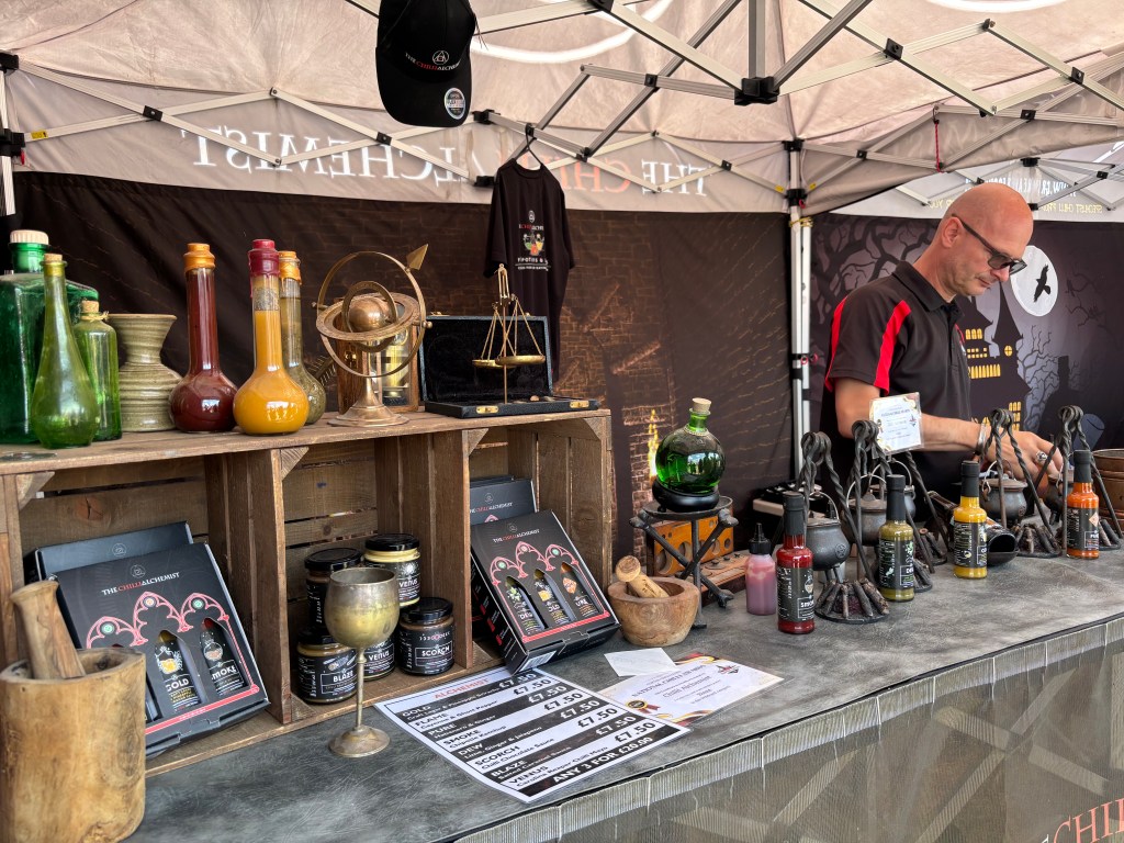 Chilli enthusiasts are in for a treat as well. The festival embraces the heat and intensity of chili peppers in all their forms. From mild jalapeños to scorching habaneros, there’s a huge range of chilli sauces, jams, dips, pickles, rubs, oils, biscuits, plants, even chocolate on offer. Pictured below: The Chilli Alchemist with this year’s festival favourite – Chilli Salted Caramel. It sounds wrong, but it works!