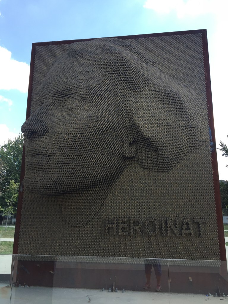 In the park opposite is the Heroinat Memorial. This imposing sculpture depicts a Kosovar woman using 20,000 pins placed at different heights, thus creating a portrait in relief. Each pin represents a woman raped during the Kosovo War. Viewed from afar, you see the face of a woman. Closer up, the individual pins become visible.