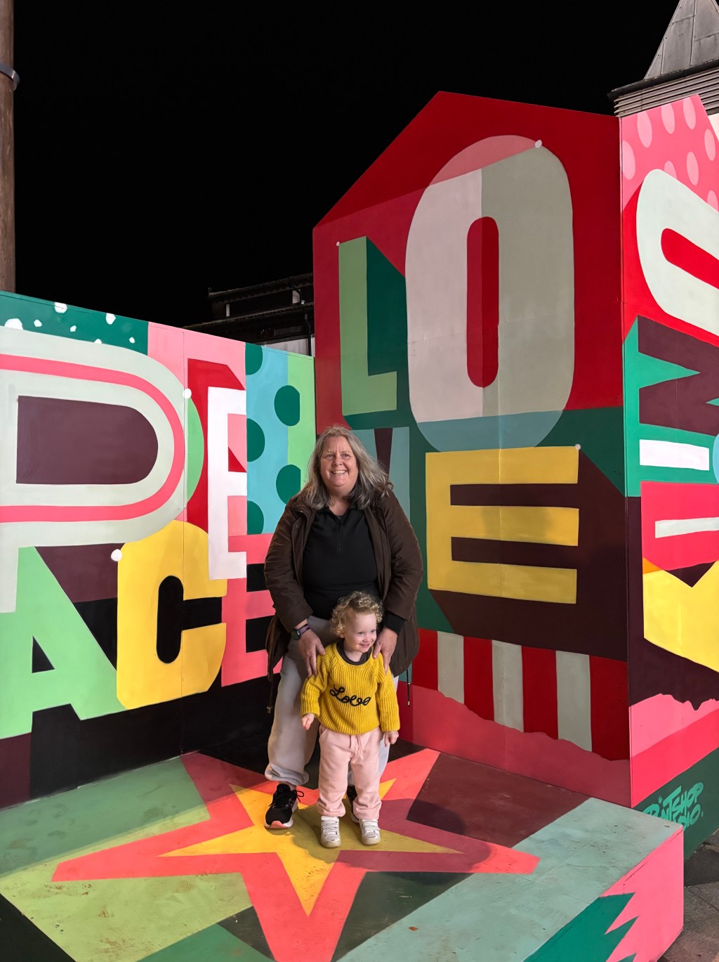 There are light features running throughout the town. From neon lights in the trees to illuminated decorations projected onto the pavement. Orla was mesmerised by these.