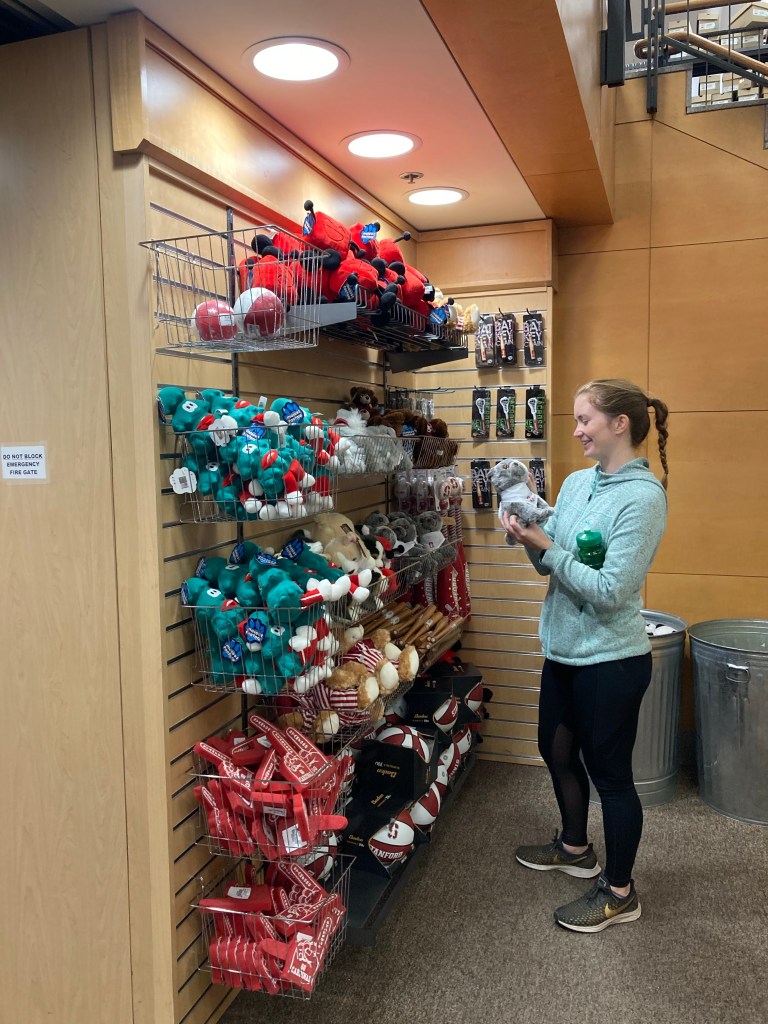 The title ‘bookstore’ doesn’t really adequately describe this place. The 4 storey warehouse contains pretty much any item you can imagine (and plenty more) with a Stanford logo added. The range of goods available – and the prices – always make us giggle.